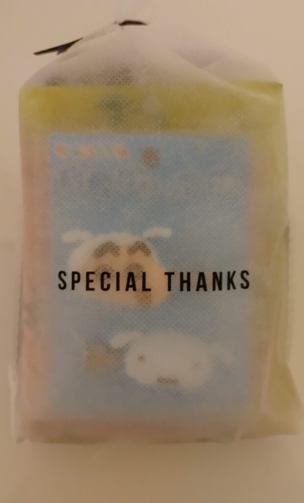 ラッピングの袋は娘が友達の誕生プレゼントをラッピングするのに娘が購入した袋の残りがあったので使わせていただきました。偶然にもぴったりでした。