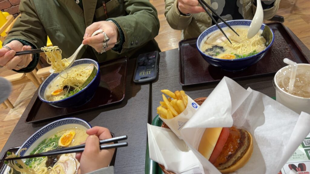 ・お昼ご飯 東京タワーのフードコートで娘はモスバーガー、それ以外の者は宇明家の豚骨ラーメン